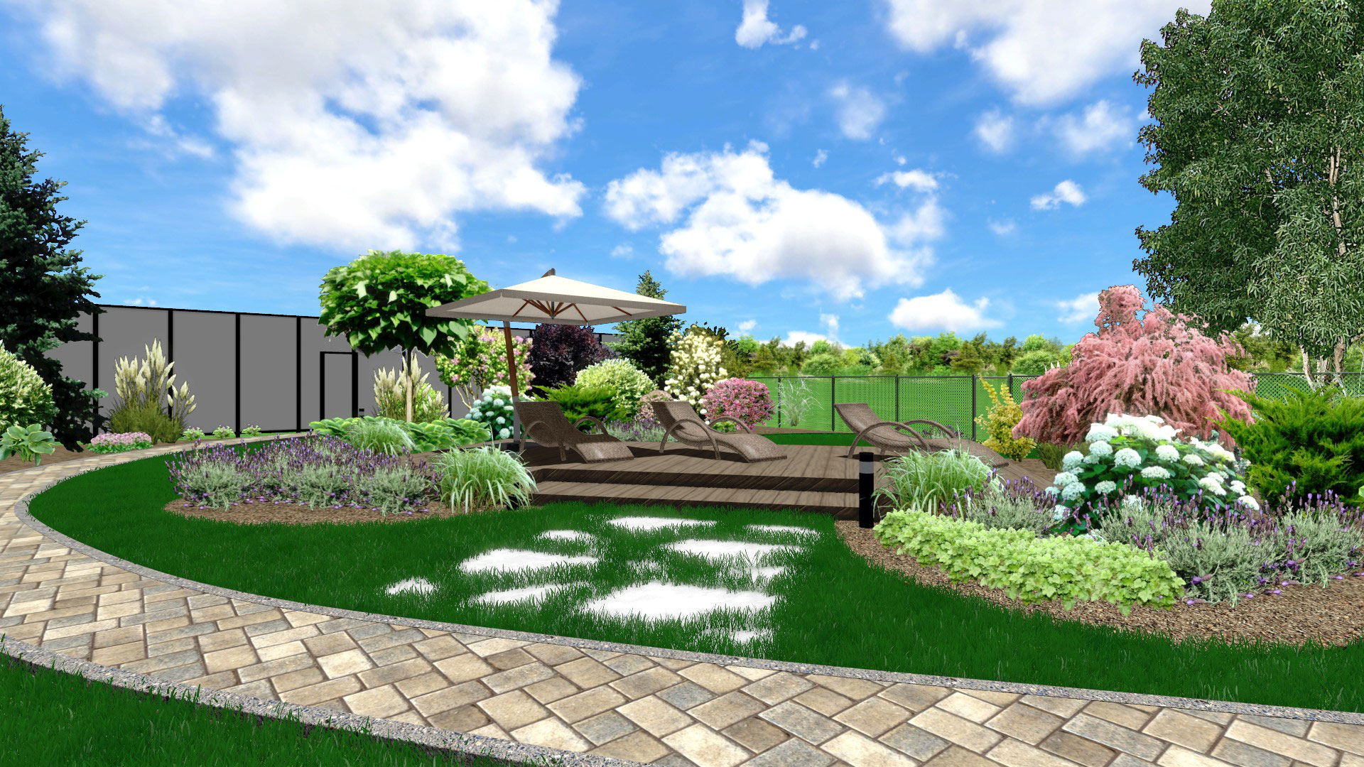 Звивиста обхідна доріжка із затишними куточками для відпочинку та яскравими посадками рослин у вигляді острівців на газоні.