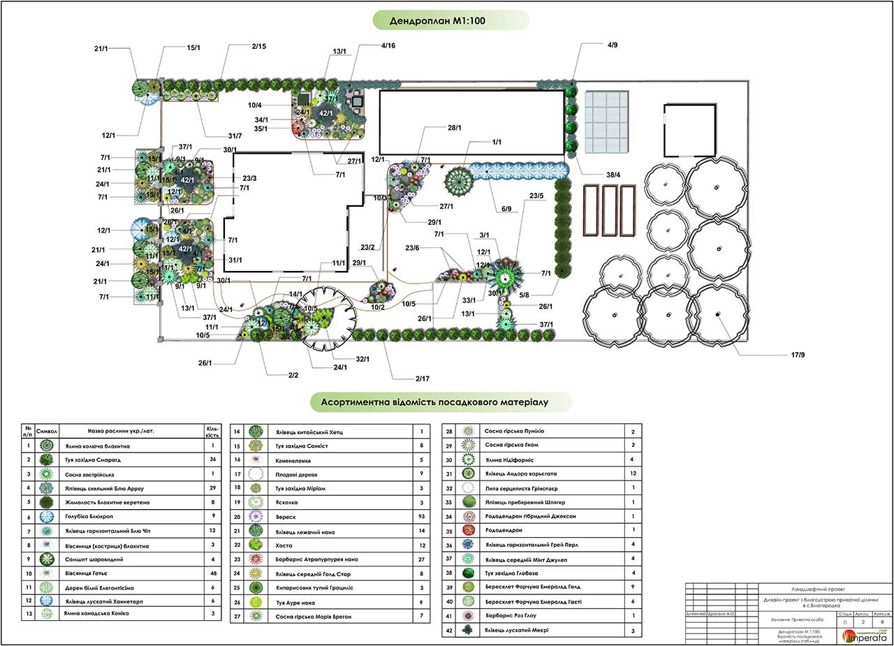 Більша частина ділянки освітлена протягом усього світлового дня, що дозволило повною мірою виконати побажання замовника про використання різних сортів та відтінків хвойних рослин, створюючи таким чином мікс з посадки хвойних і квітучих ґрунтопокривних рослин, таких як: флокс шиловидний, ломикаменя, верес.