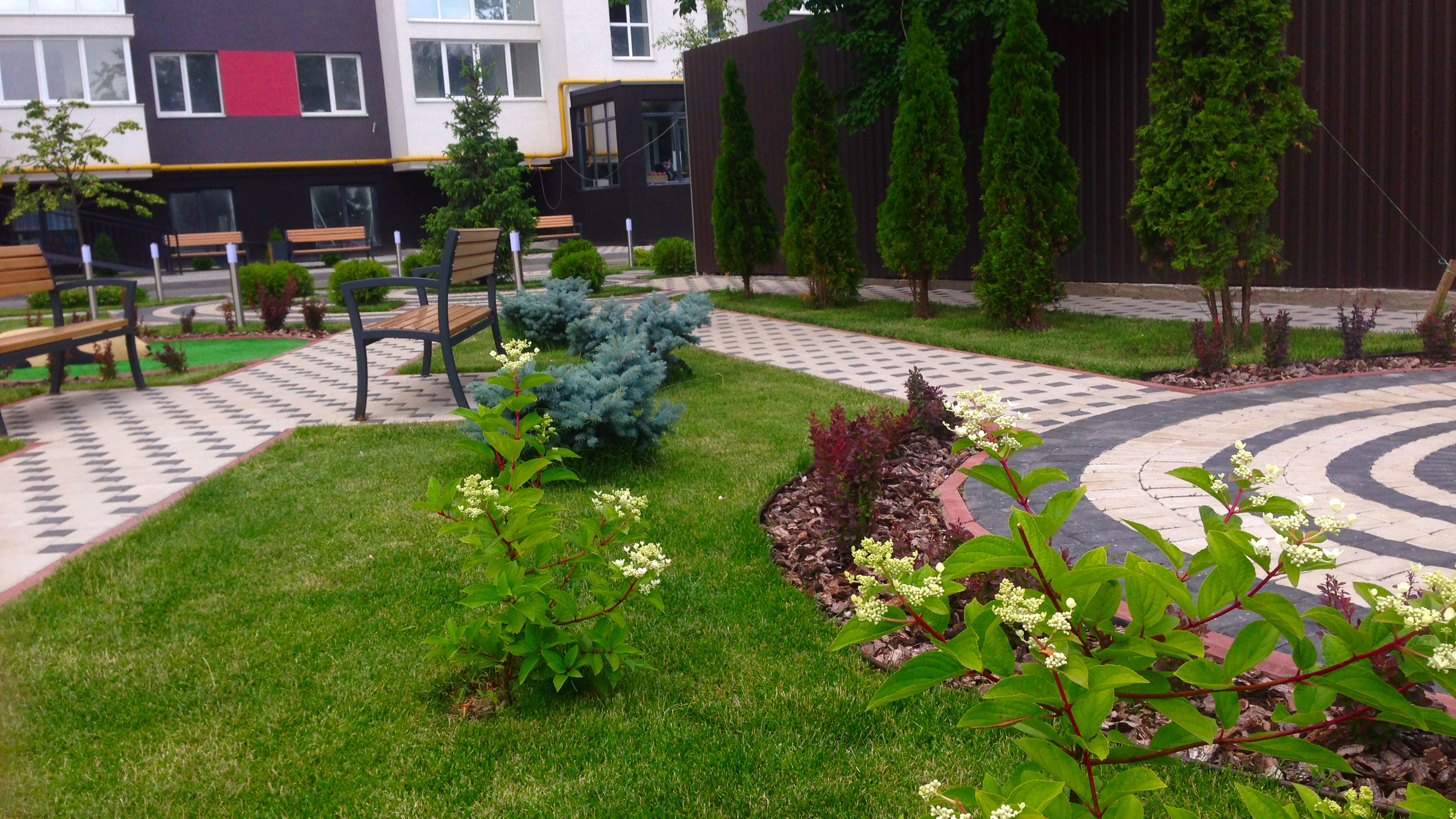 Система доріжок та кільцевих майданчиків була реалізована на основі генерального плану житлового комплексу. Основним рішенням у озелененні стало використання листяних дерев, хвойних рослин та квітучих чагарників, які невибагливі у догляді та створювали б стійкий зелений каркас у зимовий час.