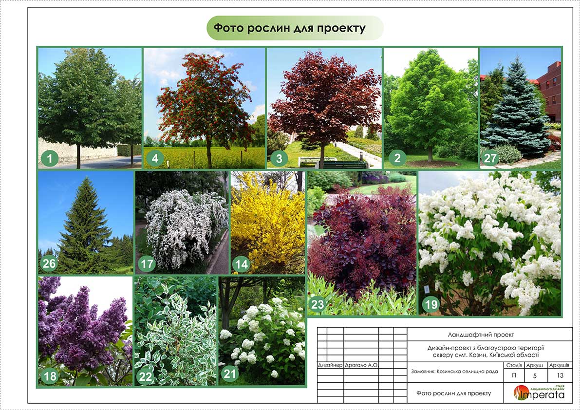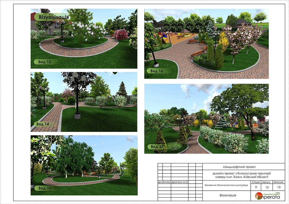 Звивисті доріжки, відкриті галявини, майданчики для відпочинку, алея з лип, групові посадки хвойних і листяних чагарників є основними утворюючими елементами простору. В озелененні парку використані такі листяні дерева: Клен гостролистий, Клен Роял Ред, Глід Поль Скарлет, Магнолія, Сакура, Липа, Горобина.