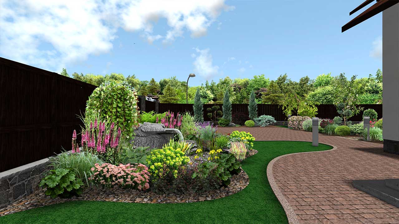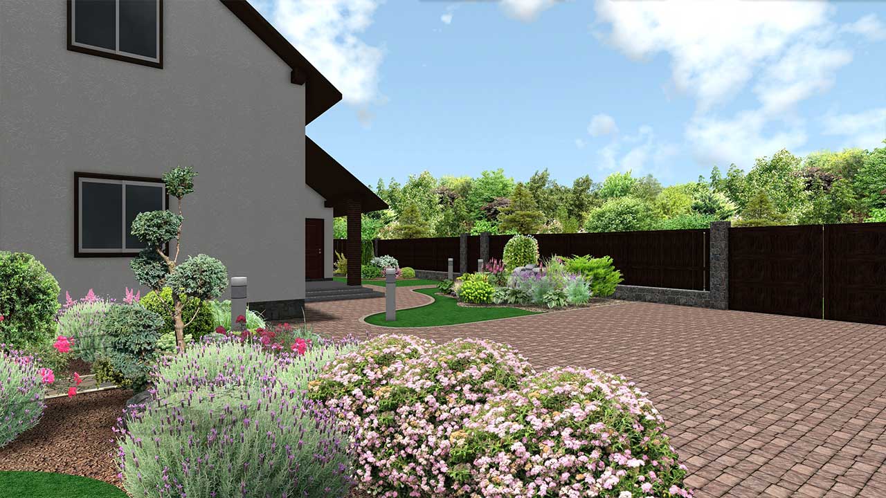 Декоративні групи рослин розміщені в куточках та вздовж плавних садових доріжок, завдяки чому максимально досягається ефект природності. Прогулюючись доріжками гості та господарі можуть насолодитися мальовничими краєвидами різних куточків ділянки, а також відпочити на садових гойдалках.